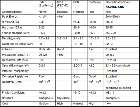 The Radial Arc is ideal for ta-C deposition. The difficulties of running a stable vacuum arc on graphite, along with elimination of the copious macroparticles produced, have been overcome. Radial Arc carbon ion deposition allows precise control of deposition energy while maintaining low temperature, resulting in tetrahedral amorphous carbon (ta-C) films that can be 10 times harder than films deposited using non-ionized processes, such as sputtering. (See table below.) The Radial Arc offers optimal diamond film properties, together with practical deposition rates uniform over large areas from an uncomplicated, compact source.